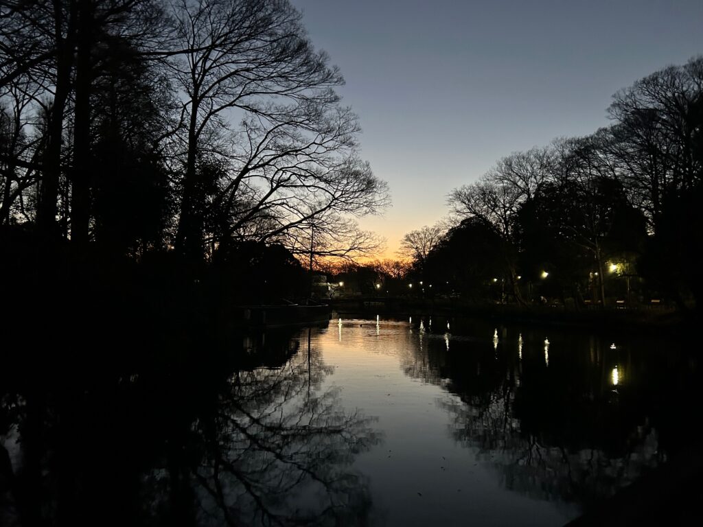 まだ暗い井の頭公園を、落ち葉をかさこそ言わせながら歩きます。