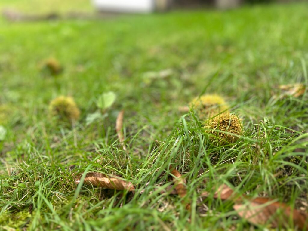 あちこちに栗の青いイガが落ち、