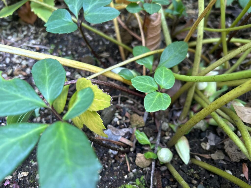 庭のクリスマスローズの葉っぱを手でよけてみると、