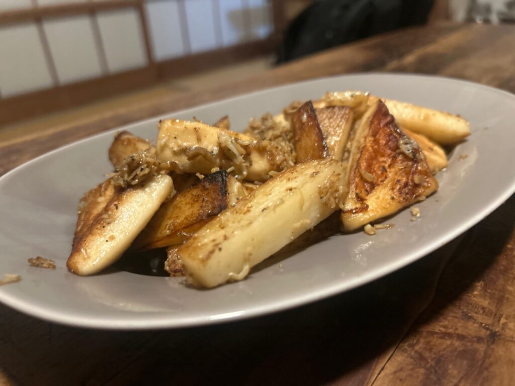 フライパンにバターを溶かして長芋をカリッと炒め、
