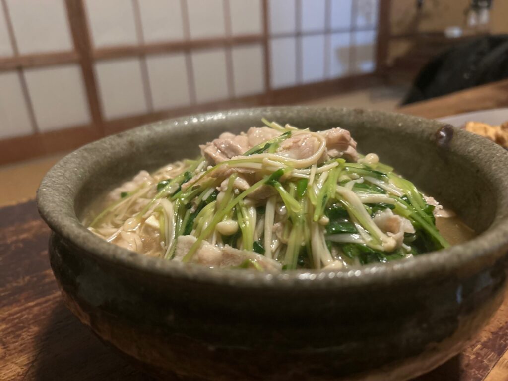 えのきと豆苗を加え、みりんとしょうゆで味付けし、