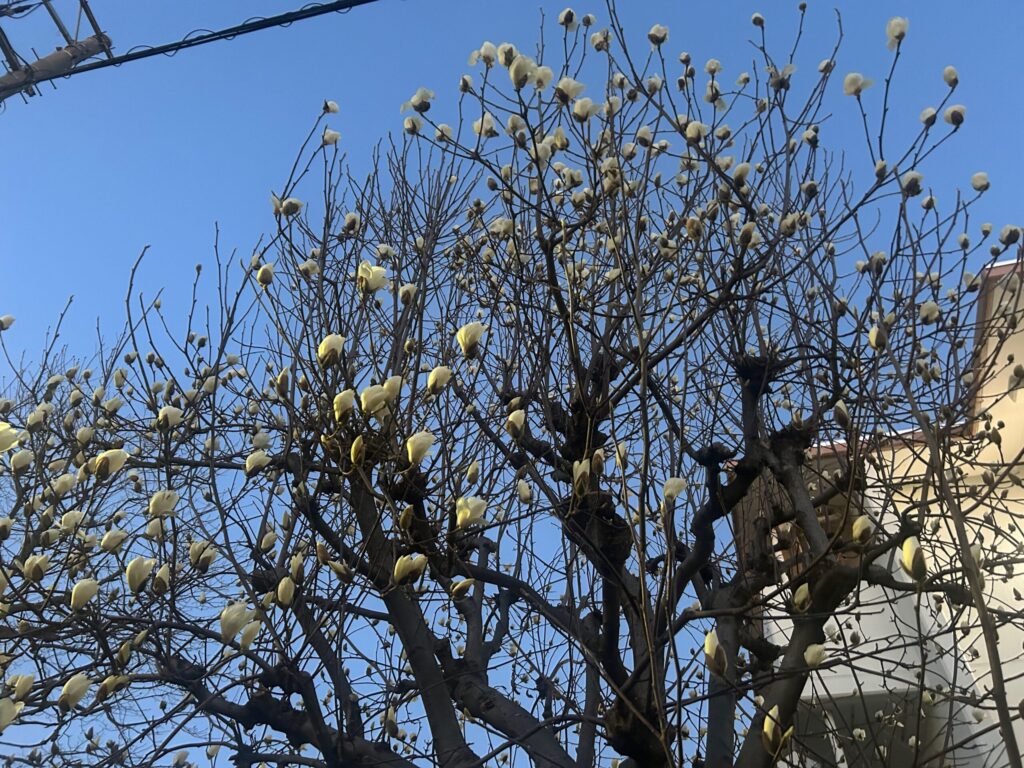 ウォーキング途中の公園の木蓮の木が花盛りです。