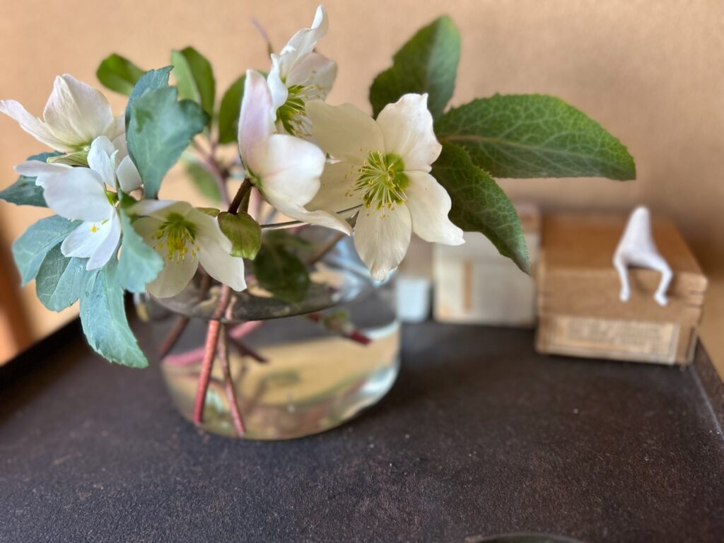 庭に次々に咲くクリスマスローズを部屋に生けてみました。