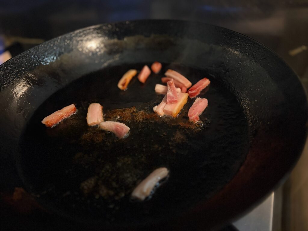 その間に、オリーブオイルでベーコンをカリッと焼いて、
