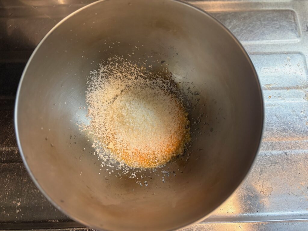 卵とパルメジャーノをボールに入れてよく混ぜてスタンバイ。