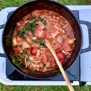 ほうれん草1/2羽と半分にカットしたプチトマト5〜6個を入れて、煮込む。味を見て、塩で調整。(今回は、アフタヌーンティーのトマトドレッシングが余っていたので、入れて調整しました)