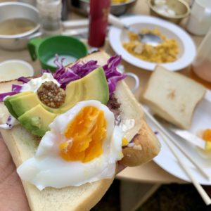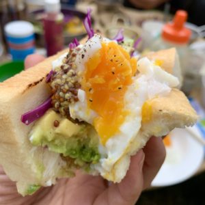 パンにバターを練り、半熟玉子、紫キャベツ、アボカド、サワークリーム、粒マスタードをサンド。
