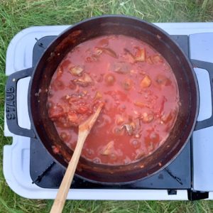 戻ったら、お昼ごはんの準備です。今日は拓郎さんが、鴨南蛮蕎麦をイメージした「鶏南蛮そうめん」を作ってくれるとのこと。山の家の庭で採れた茄子も入れてもらいました。