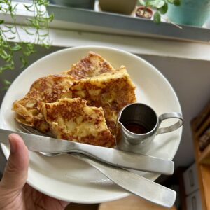 次の日の朝ごはんはフレンチトースト。表面がカリカリになるまでじっくり焼きました。メープルシロップをたっぷりかけて。