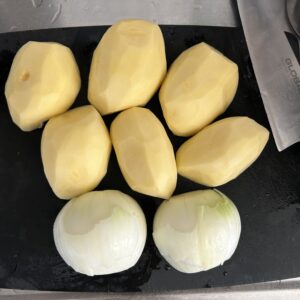 まずは、じゃがいもポタージュのベースを作っていきます。じゃがいも6個、玉ねぎ1個分、たっぷり作って、朝用に冷凍します。