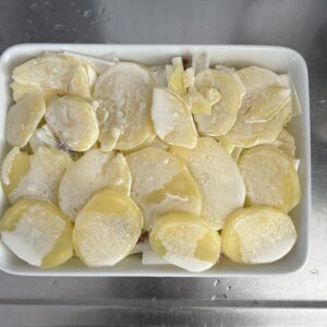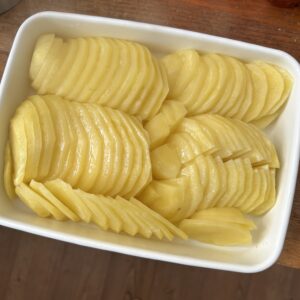 今日はポテトグラタンを作ります。今日は、栗原はるみさんの料理本でよく作っていたグラタンを作ります。このグラタンのいいところはホワイトソースのかわりに生クリームを使うところ。まずはじゃがいも4個を薄くスライスし、レンジで火を入れていきます。