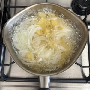 じゃがいもはひと口大に、玉ねぎはスライスしたら、ひたひたの水を入れて火をかけていきます。