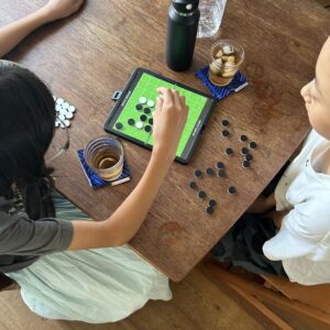 外遊びから帰ってきた娘たち。オセロを始めてました。