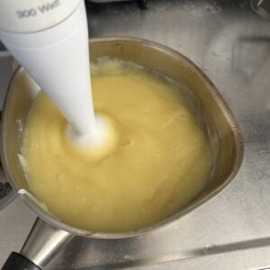 煮えたら、塩を小2入れて、ハンドミキサーで撹拌。