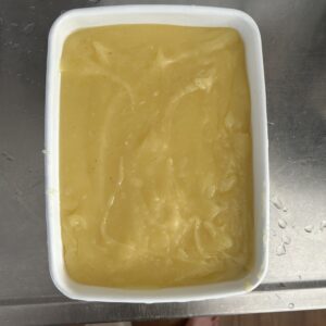 粗熱が取れたら、グラスに移し、残りはバットに入れました。あとは1〜2時間冷やし固めるだけ。早く固まってくれますように。