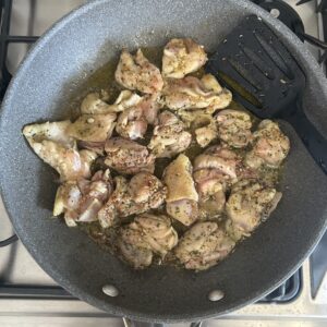 食べ終わった後は夕飯準備をしていきます。グラタンに合わせて、今日はバジルチキン。鶏もも肉をにんにくと塩で炒めて、バジルペーストを絡めます。