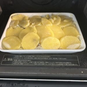 グラタンは一度電子レンジで15分かけて、生クリームの水分を飛ばします。ここはオリジナルレシピにはなかったのですが、私はこうして作っています。