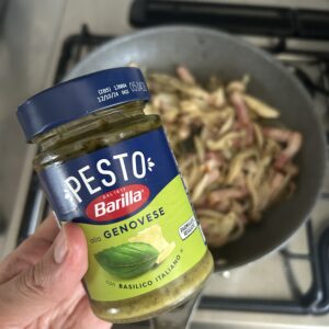 ここにペンネの茹で汁、白ワインを入れて乳化させます。今回はバジルチキンにも使ったこのペーストを使います。