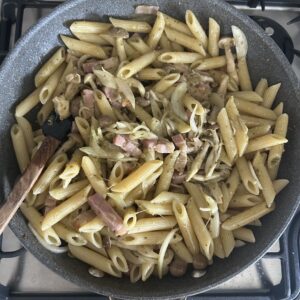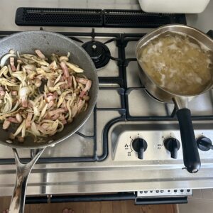 続いてジェノベーゼペンネを作ります。カットしたベーコン、しめじ、玉ねぎをにんにくみじん切りを入れたオリーブオイルで炒めます。