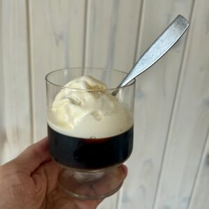 コーヒーゼリーが固まったので、バニラアイスを乗せてコーヒーゼリーフロートの準備をしました。