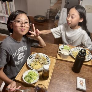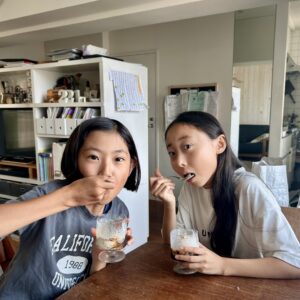 お友達と楽しそうに食べる娘。この後、この友達の家に移動してお泊まりさせてもらうことに。いい夏休みのスタートになってよかったなーと思いました。