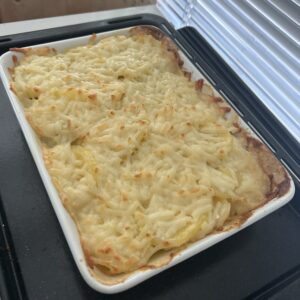 耐熱皿に、火が通ったじゃがいも、長ネギ、オイルサーディンを重ねて、生クリームを入れます。あとはチーズを乗せて焼くだけ。