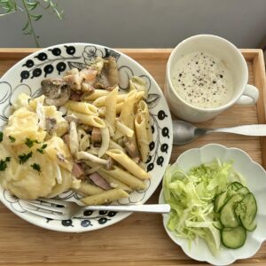 バジルチキン&ペンネとグラタンはワンプレートにしました。グラタンには冷凍しておいたパセリ(山の家産)を刻んで散らしました。あとはじゃがいもポタージュベースをカップ半分くらい入れて、冷たい豆乳で割ったビシソワーズスープとサラダを準備しました。