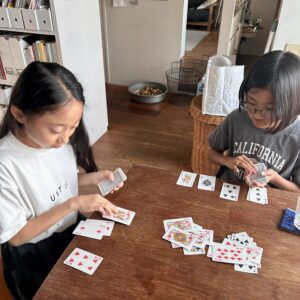 トランプのスピードをやって遊んでいました。今日はお友達は夕飯まで食べていく予定だったので、「おふたりさま、そろそろ夕飯にしましょうか?」と聞くと、「お腹すいた〜!食べたーい」と良い返事。