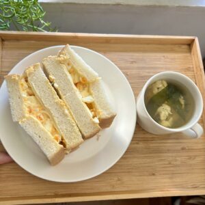 息子の朝ごはんはたまごサンドとわかめスープ。荒目に刻んだ半熟卵でたまごサラダを作ったら、ほぼゆでたまごのサンドイッチになりました。