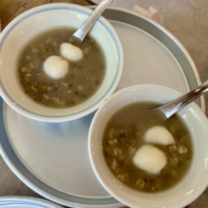 そして期間限定の甘い緑豆スープをシェアしました。デザートまで頼む私たち。笑