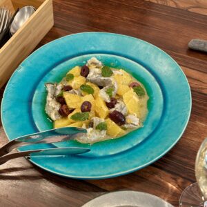前菜で頼んだ「お刺身エビとオレンジのセビーチェ」。レモンでマリネしてあり、少しスパイスも効いていてとても美味しかったです。