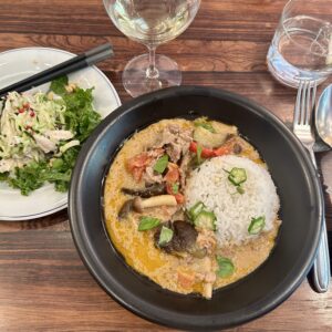 最後にタイグリーンカレーが登場。ジャスミンライスにオクラが混ざっている!タイカレーだけど薄切りの牛肉が使われているのもなかなかない組み合わせ。カレーもサラッとしていて、ぜんぜん重くなく食べられました。
