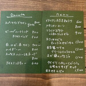 スヌ子さんのお酒に合うお料理が楽しめるということで、知り合いの友人が予約してくれました。基本的にはコースメニューですが、たまたまランチ営業もしている日だったので、ラッキーでした!この日のアラカルトメニューはこちら。メニューはどれも気になるものばかりでしたが、みんなでタイグリーンカレーをオーダーすることにしました。