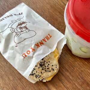持ち帰った焼餅(台式焼きパン)に卵焼きやハムをサンドして次の日のサラダ弁当と一緒に持っていきました。