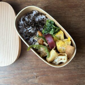 学校がある息子のお弁当も完了。チンジャウロース、春巻き、甘い卵焼き、さつまいも甘露煮、ほうれん草ソテー。