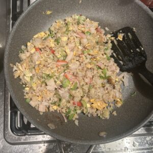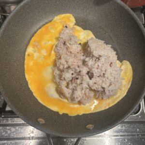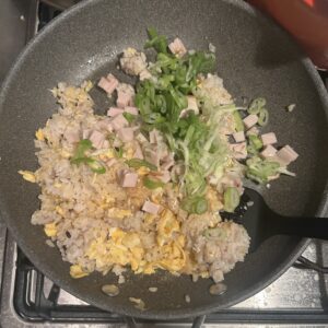 息子のメニューも炒飯にしました。フライパンに卵を割入れ、冷やご飯を一緒に炒めます。