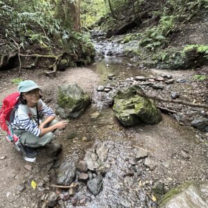 沢に降りて、ママ、気持ちいいよ!と水をさわる娘。
