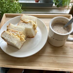 先月の天気が良かった週末。朝ごはんはたまごサンドとホットチャイにしました。たまごサンドのフィリングはレンチンで作るゆで卵(黄身にフォークで穴を3〜4回刺してから水を大2ほど入れて、600w50〜60秒)を覚えてから、朝の時間でも思い立ってすぐにたまごサンドが作れるようになりました。