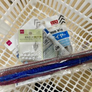 今日は夜、ワイヤーアートの工作をするため、100均で材料を調達して帰りました。