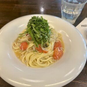 パスタが運ばれてきました。私がオーダーしたのはしらすと大葉のペペロンチーノ。