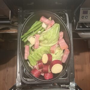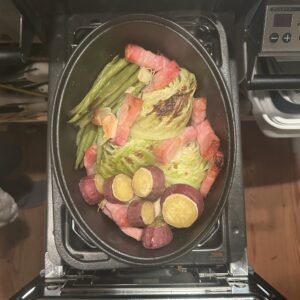 その間、私はダッチオーブンに厚切りベーコンとカットした野菜を入れていきます。今日いれたのは、キャベツ、いんげん、さつまいも。塩とオリーブオイルを回しかけ、20〜30分魚焼きグリルに入れて行きます。