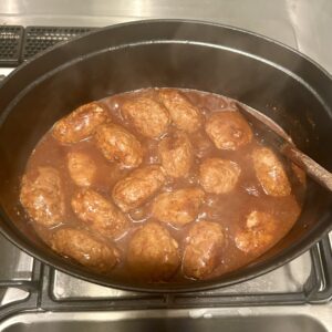このくらいまで焼き目がついたら、鍋に移して煮込んでいきます。