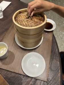 点心セットが到着。小さめの蒸篭が3段重ねで運ばれて来ます。素敵。