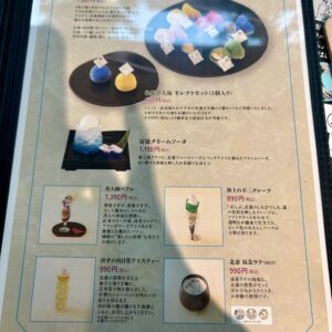 海上の不二クレープ。北斎のブルーの色彩を映したクレープに、ソフトクリームをのせて。透明なお醤油で仕立てた、ピンク色のみたらしソースをかけたもの。なかなか凝ってます。