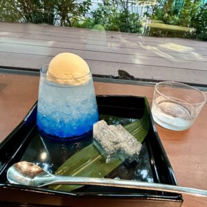 富士型グラスに、北斎のブルーソーダにバニラアイスを重ねたクリームソーダ。層になっていてきれいでした。