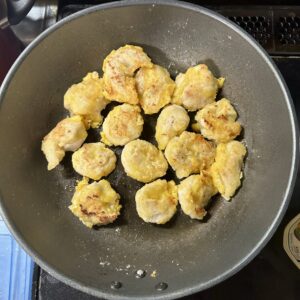 細切りした鶏胸肉を丸めて、片栗粉と卵をくぐらせて、胡麻油で両面焼いたら、蓋をして蒸し焼き。マヨネーズに少しケチャップを混ぜてたソースに和えたら、鶏マヨの出来上がりです。