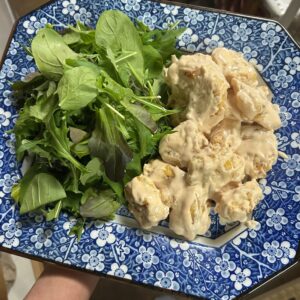 グリーンサラダと一緒に盛り合わせました。こちらは男子ウケ(息子、ダンナ、父)が良かったです。