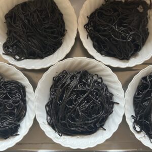 今日のお昼はイカ墨パスタ。お父さんとお母さんに食べさせたくて、無印良品でソースを調達してきました。