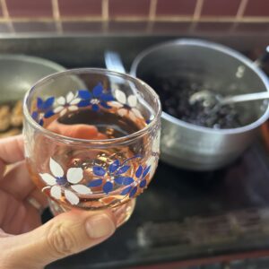 ダンナが年末年始用に買って送ってくれていたワイン。ヒトミワイナリーの赤。あと一品作る前に、お先に一杯いただきました。