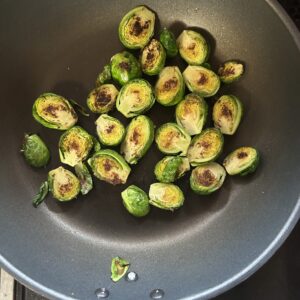 芽キャベツは塩を振って、オリーブオイルで焦げ目がつくまで焼いていきます。